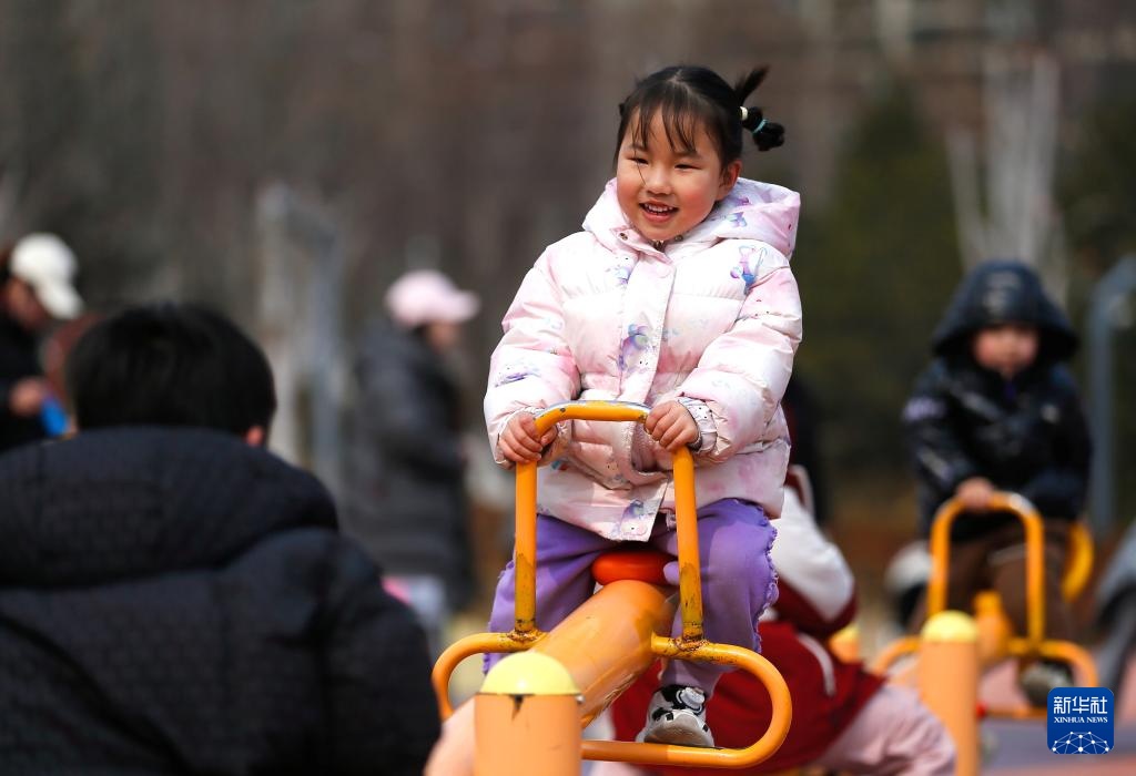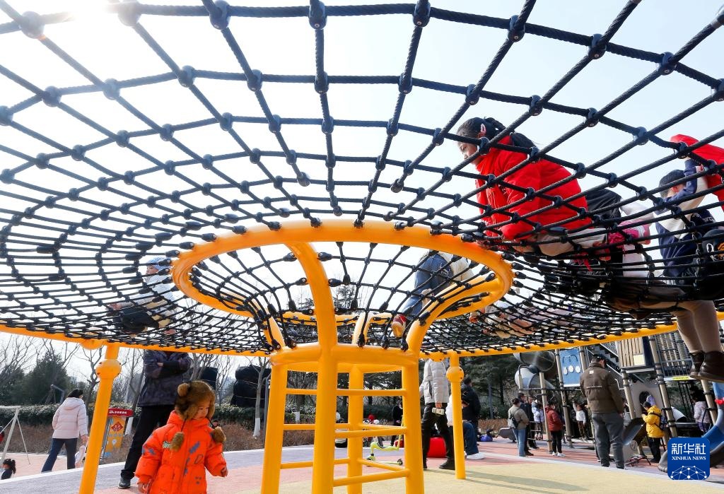 2月23日,小朋友在山东省青岛市即墨区一处口袋公园玩耍。