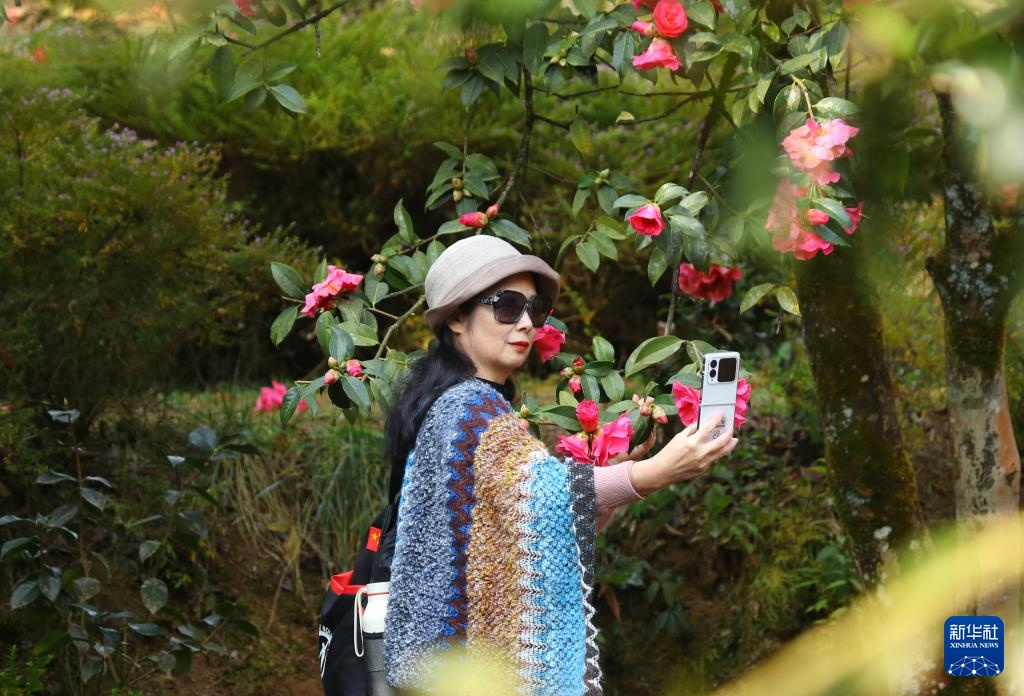 2月23日,云南省腾冲市来凤山景区茶花盛开,吸引游人打卡拍照。