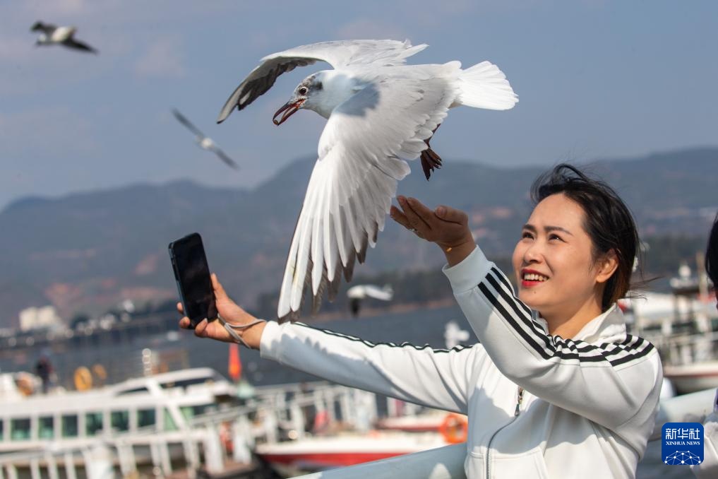 2月22日,人们在云南省昆明市海埂大坝与红嘴鸥互动。