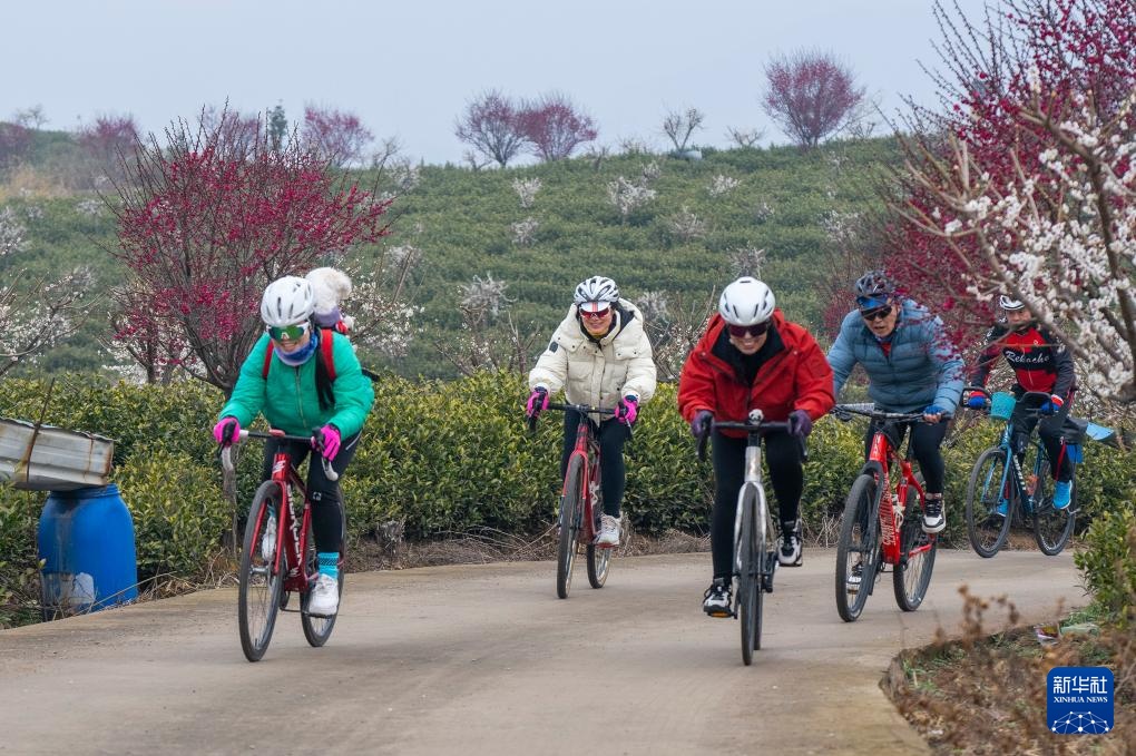 2月23日,骑行爱好者在安徽省芜湖市繁昌区孙村镇茶园骑行。