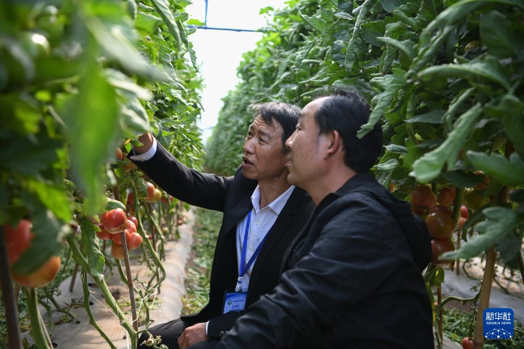 2月24日,在米易县撒莲镇,米易泽丰农业技术服务有限公司的技术总监(左)向农户了解番茄长势,并提供农技指导。