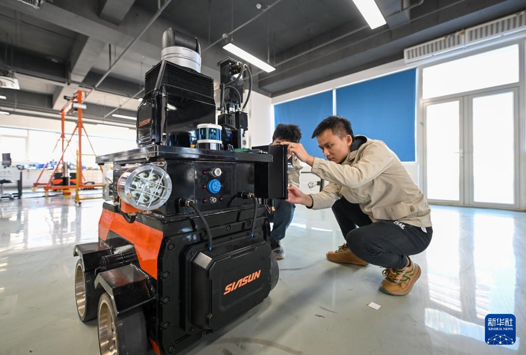 在位于京津中关村科技城的天津新松智能科技有限公司,工程师对一款矿井无人巡查机器人进行调试(2月20日摄)。