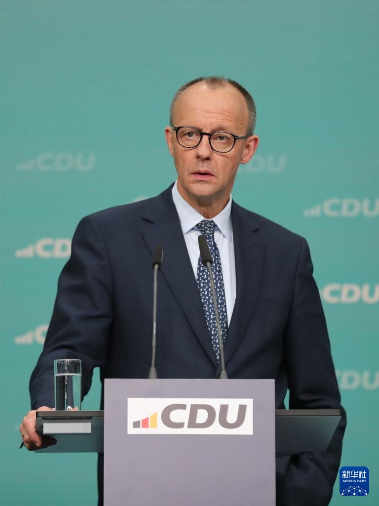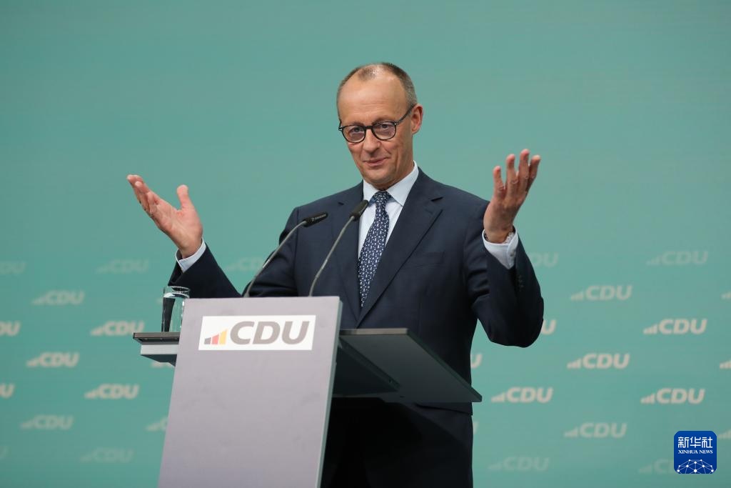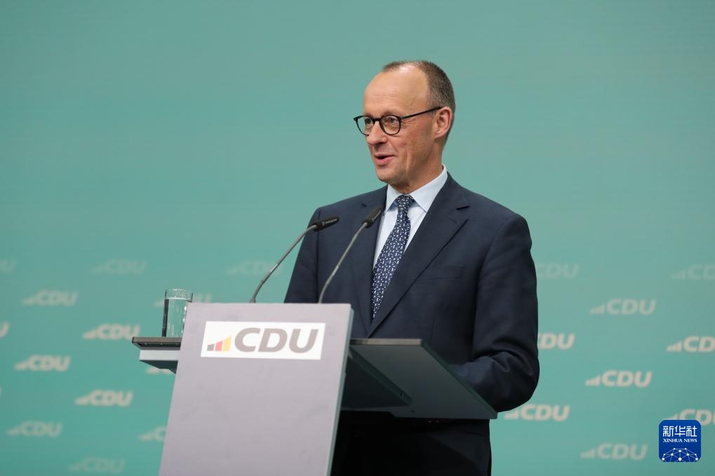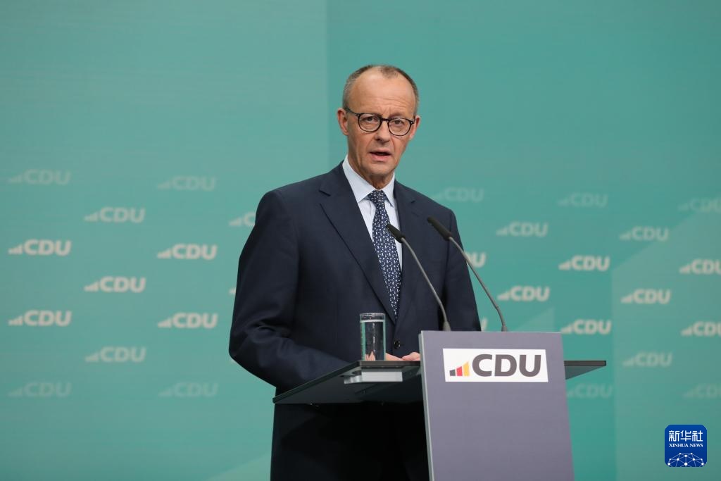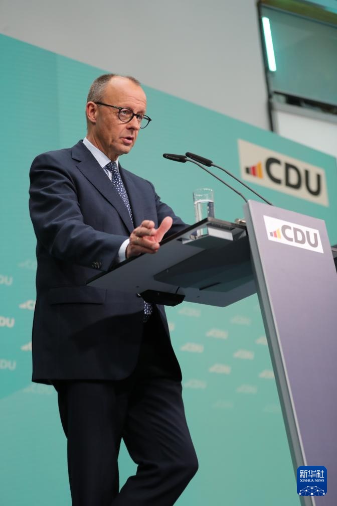 2月24日,在德国柏林基民盟总部,德国联盟党总理候选人默茨出席新闻发布会。