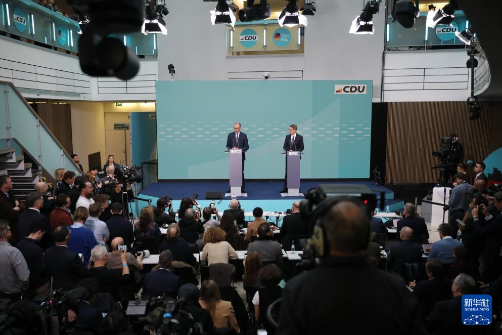 2月24日,在德国柏林基民盟总部,德国联盟党总理候选人默茨(中左)出席新闻发布会。