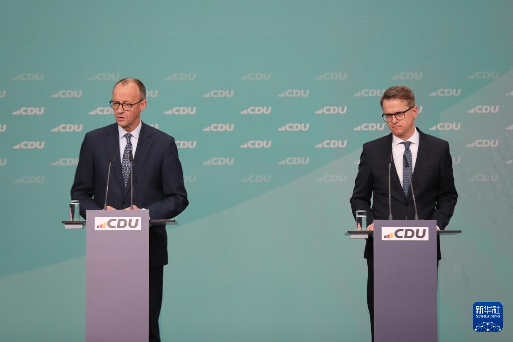 2月24日,在德国柏林基民盟总部,德国联盟党总理候选人默茨(左)出席新闻发布会。