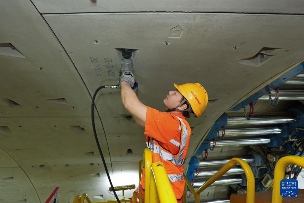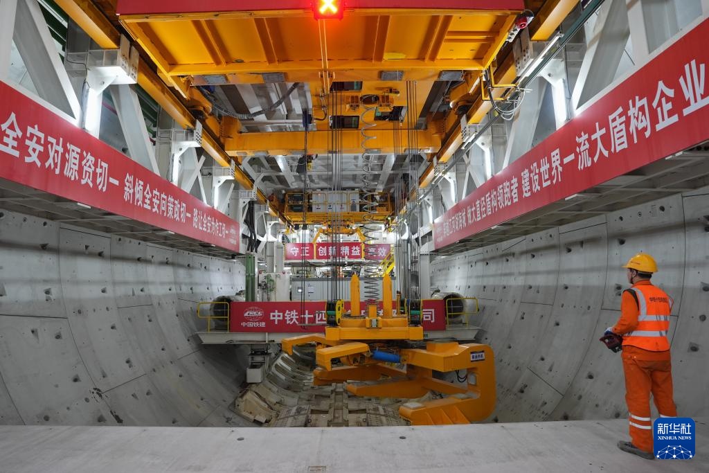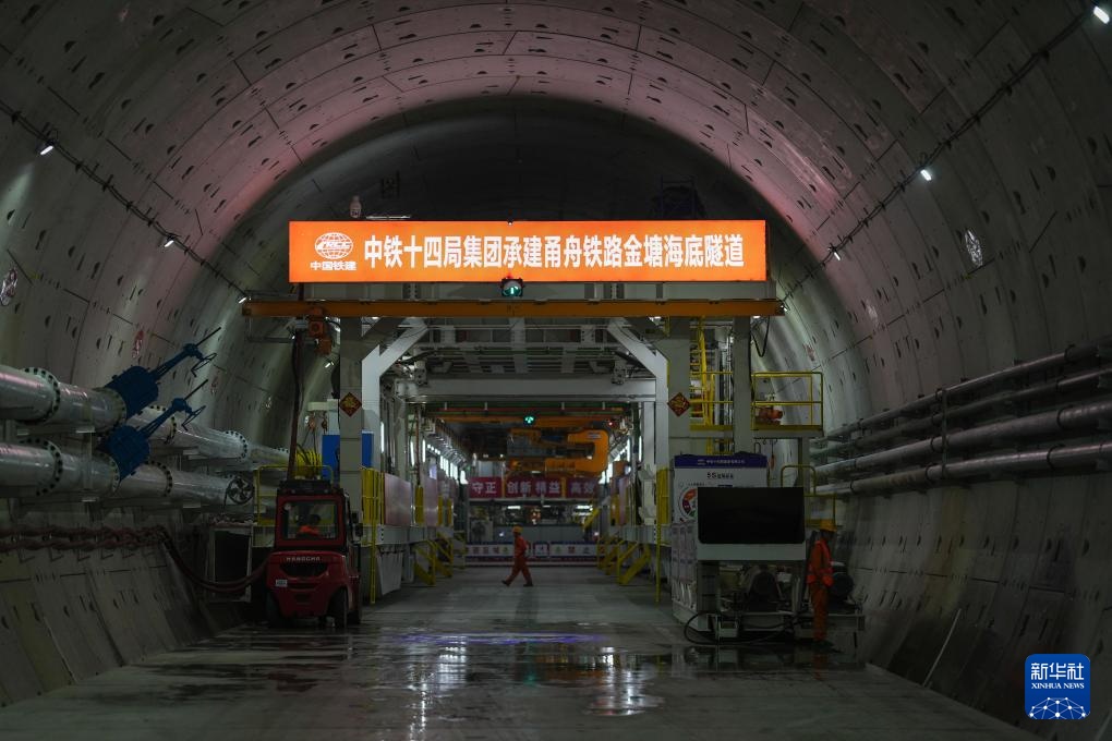 2月25日,中铁十四局建设者在甬舟铁路金塘海底隧道“甬舟号”盾构机内进行管片拼装作业。