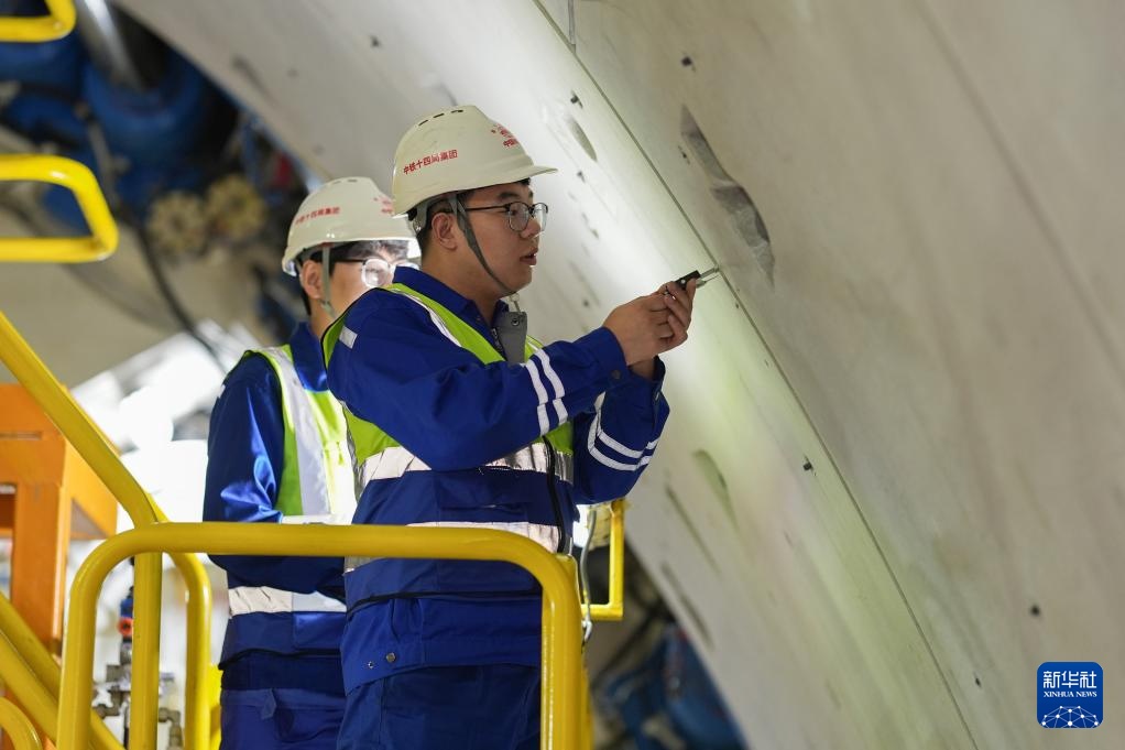 2月25日,中铁十四局技术人员在甬舟铁路金塘海底隧道“甬舟号”盾构机内测量管片拼装作业情况。