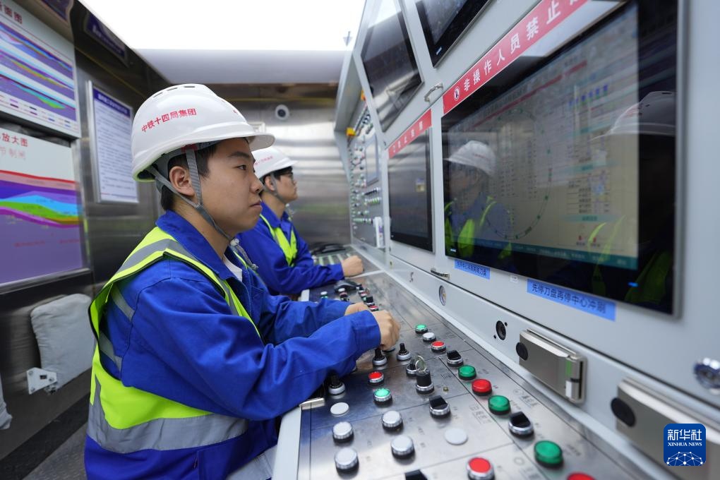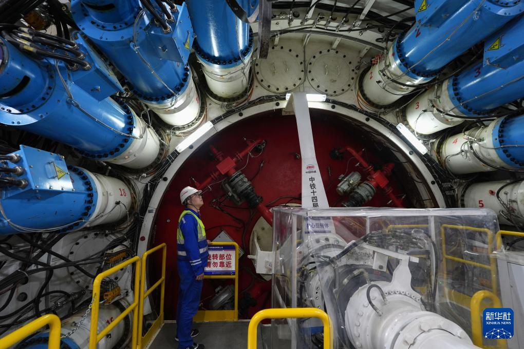 2月25日,中铁十四局技术人员在甬舟铁路金塘海底隧道“甬舟号”盾构机内关注设备运行情况。