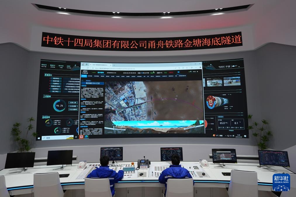 2月25日,中铁十四局技术人员在甬舟铁路金塘海底隧道“甬舟号”盾构机操作室关注设备运行情况。