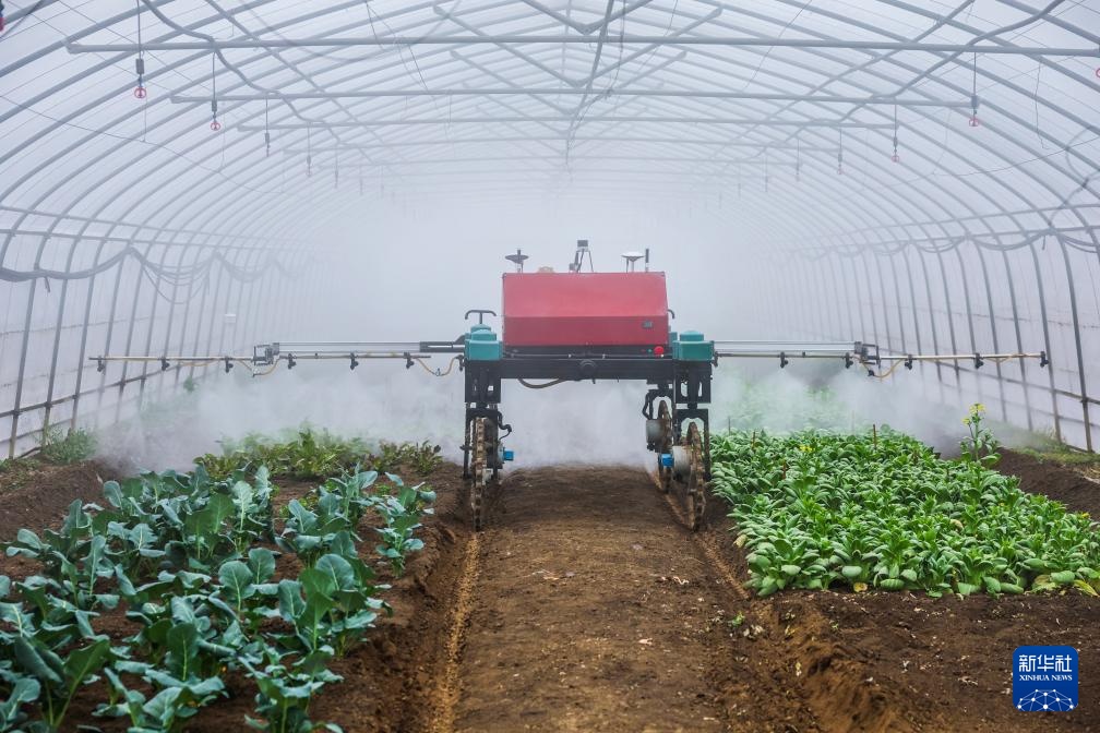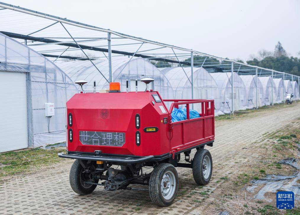 2月25日,在嘉兴市南湖区凤桥镇嘉兴世合有机农场内,无人驾驶自动喷洒机在大棚内作业。