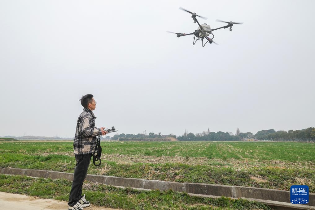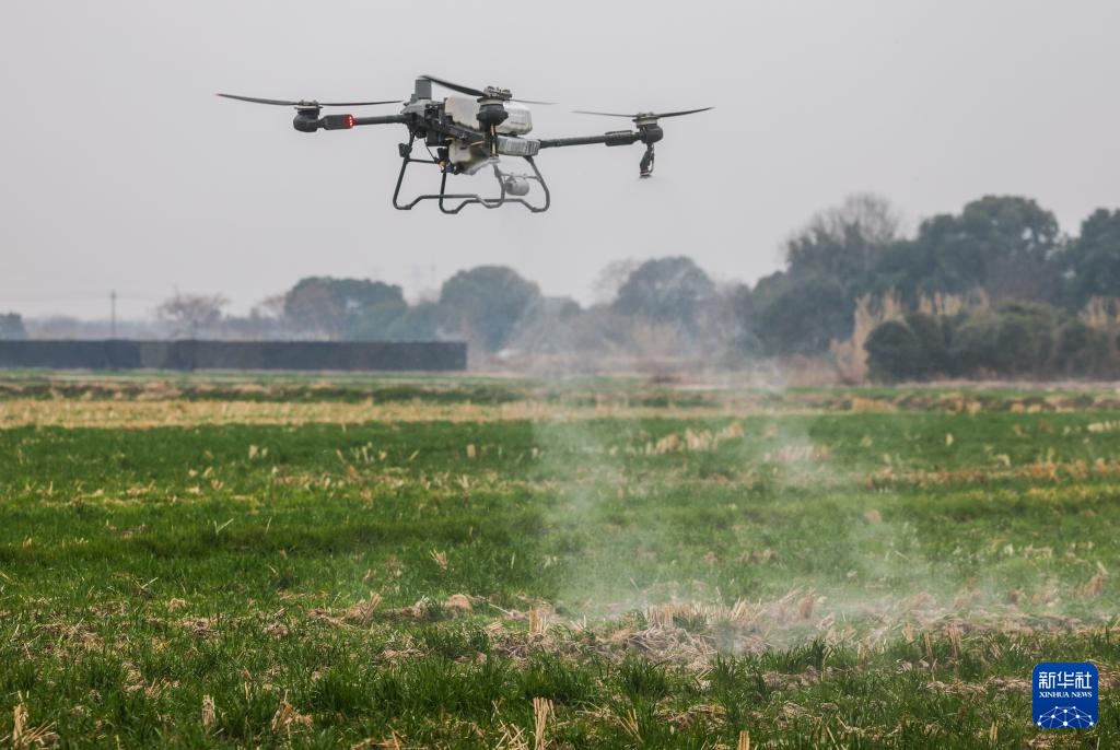 2月25日,在嘉兴市南湖区凤桥镇星火村,种植户操作植保无人机实施杂草防治作业。