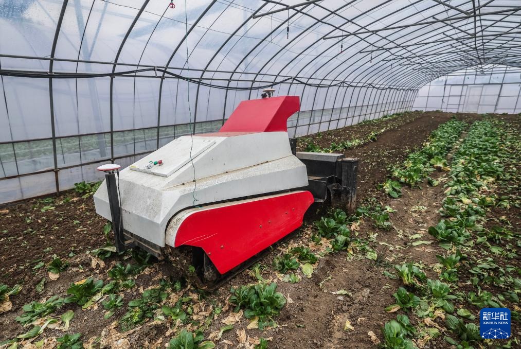 2月25日,在嘉兴市南湖区凤桥镇嘉兴世合有机农场内,自动旋耕机在大棚内作业。