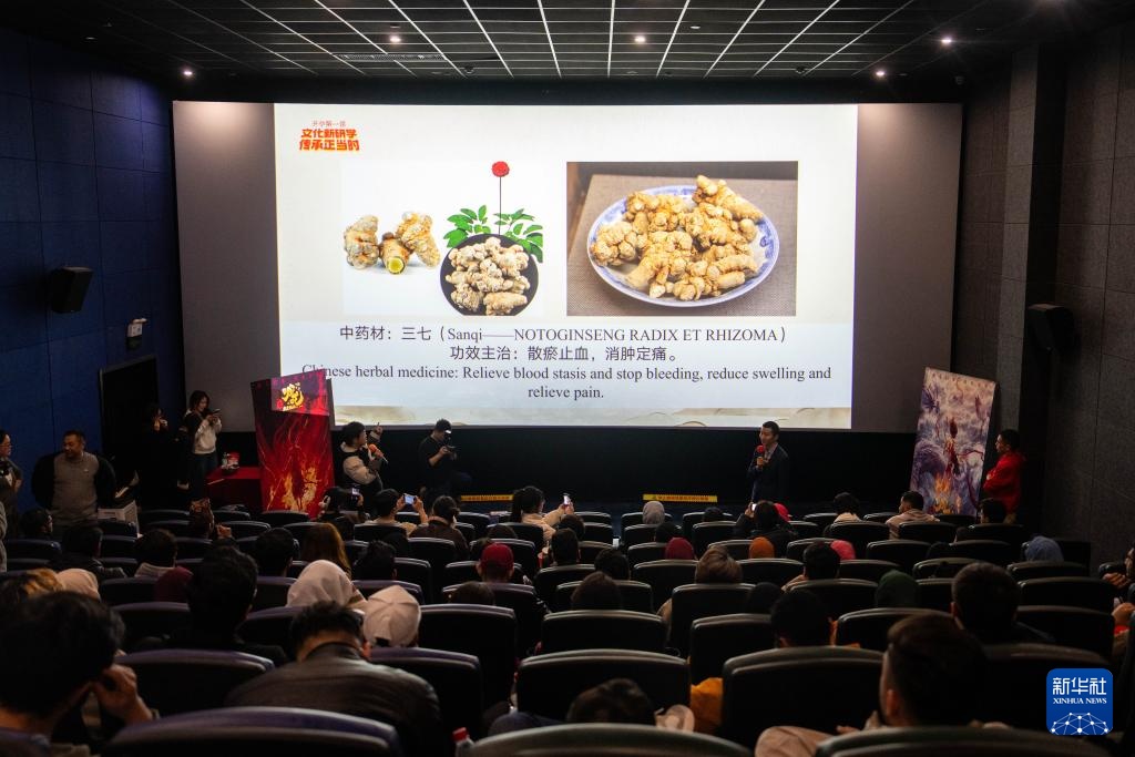 2月25日,在长沙摩天轮国际影城,留学生们在听专家讲解电影《哪吒之魔童闹海》中隐藏的中医药文化。