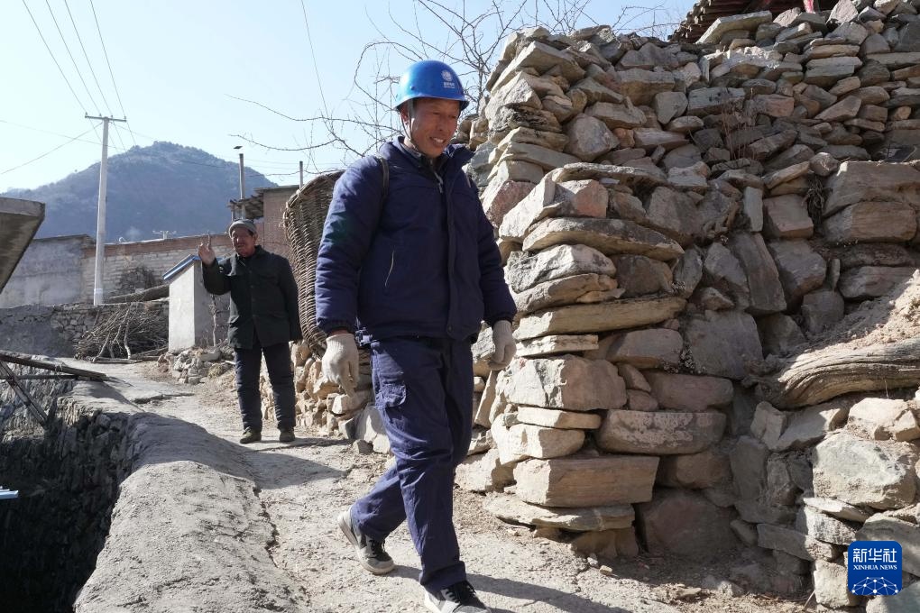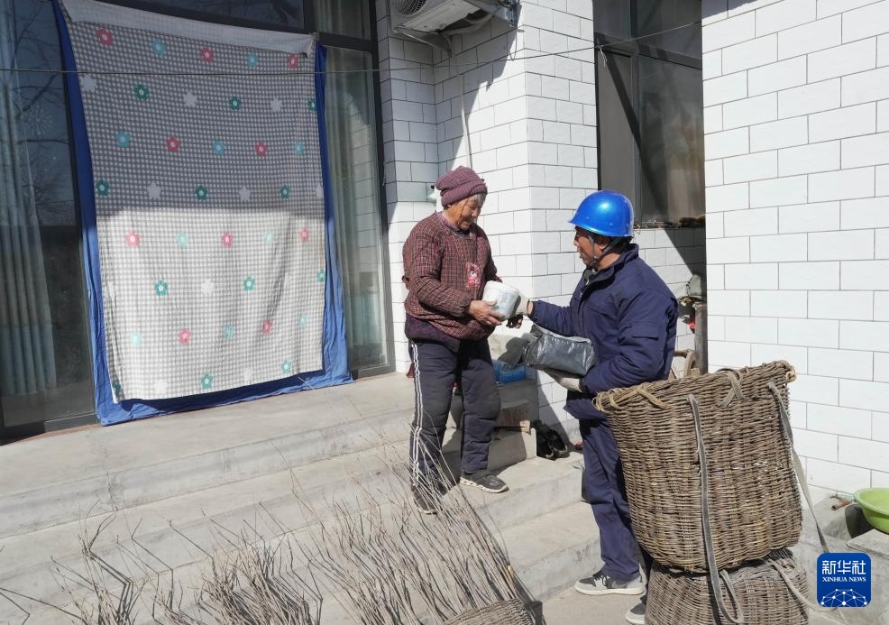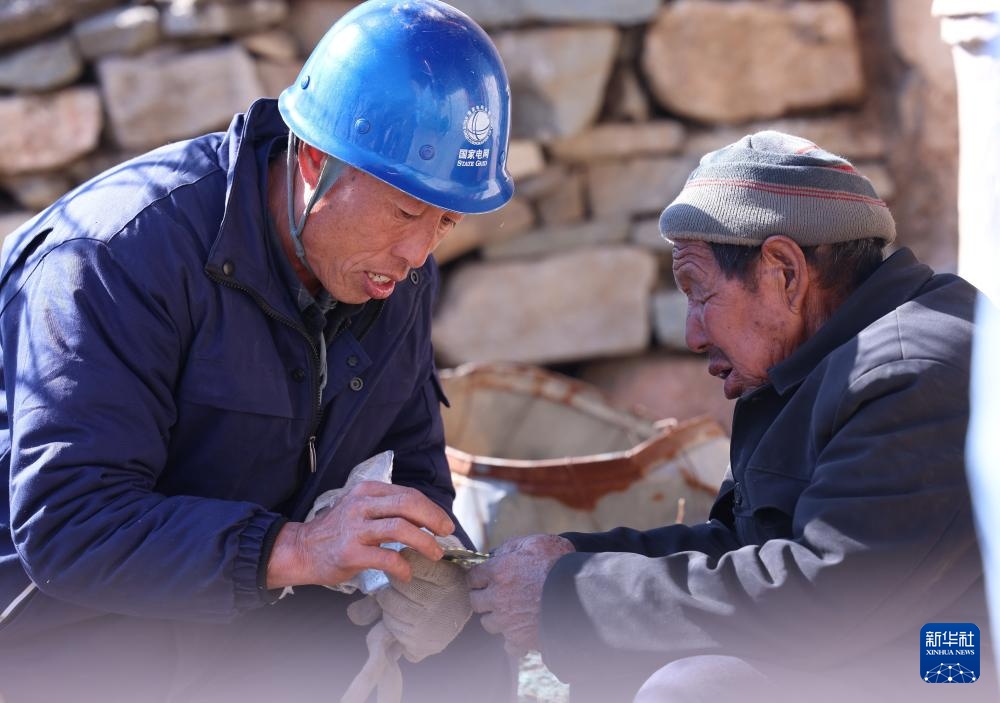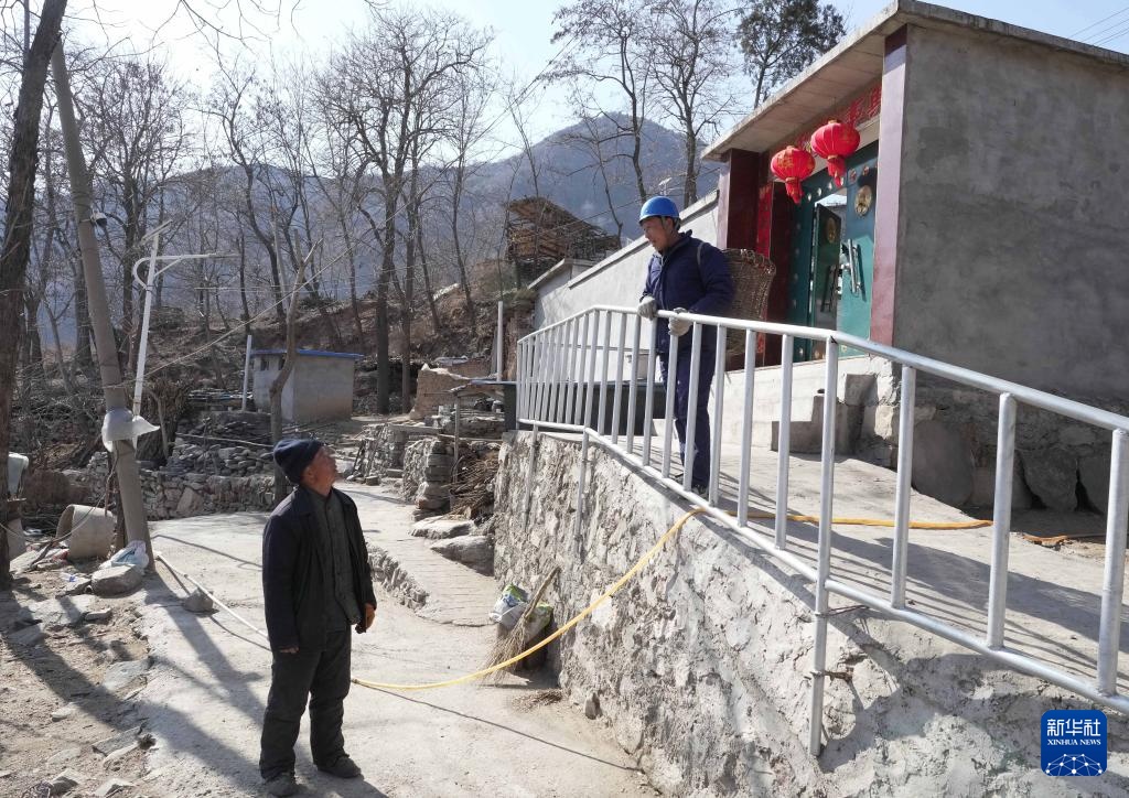 2月25日,邢海明(左)在辖区木佛塔村帮一位老人更换照明灯泡。