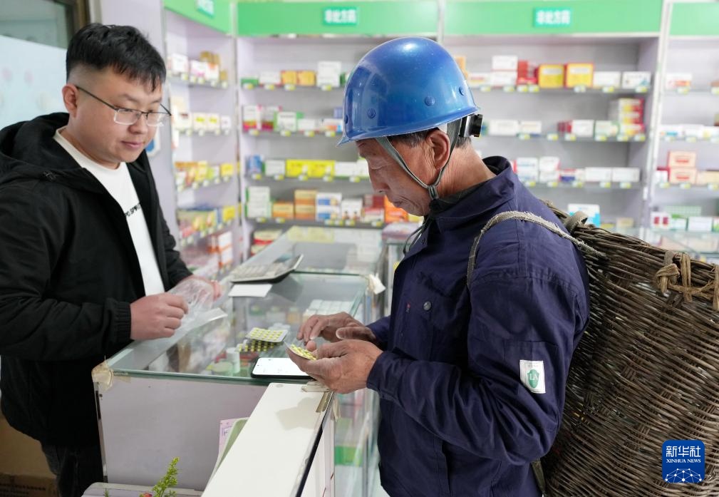 2月25日,邢海明(右)在南营乡南营村药店帮木佛塔村的一位老人代买药品。
