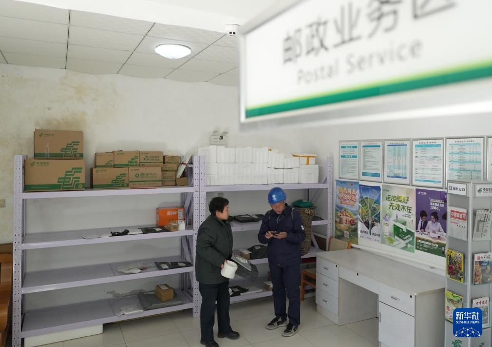 2月25日,邢海明(右)在南营乡邮政所帮木佛塔村的老人取快递。