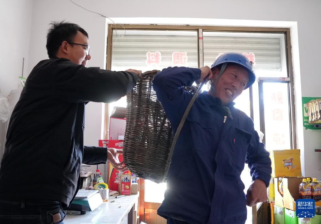 2月25日,邢海明(右)在南营乡南营村超市帮木佛塔村的老人代买生活用品。