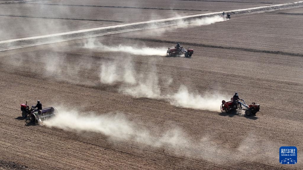 2月26日,在银川市贺兰县立岗镇通伏村,农户在田间播种小麦(无人机照片)。