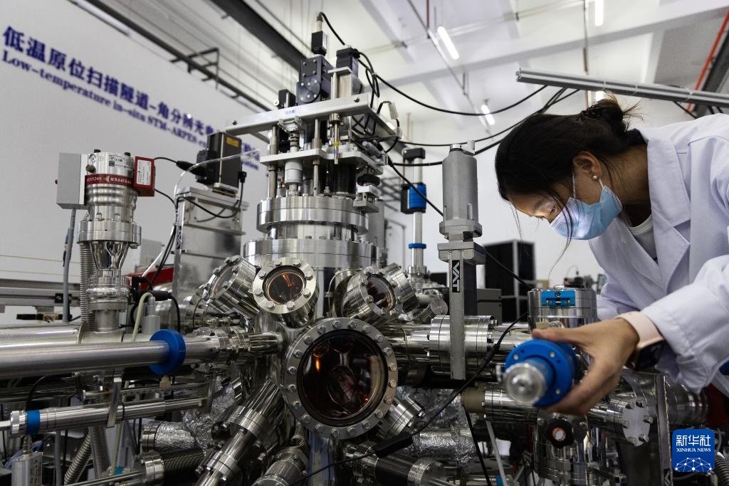 科研人员在综合极端条件实验装置(怀柔)低温原位扫描隧道-角分辨光电子谱实验站放置实验样品(2024年10月16日摄)。