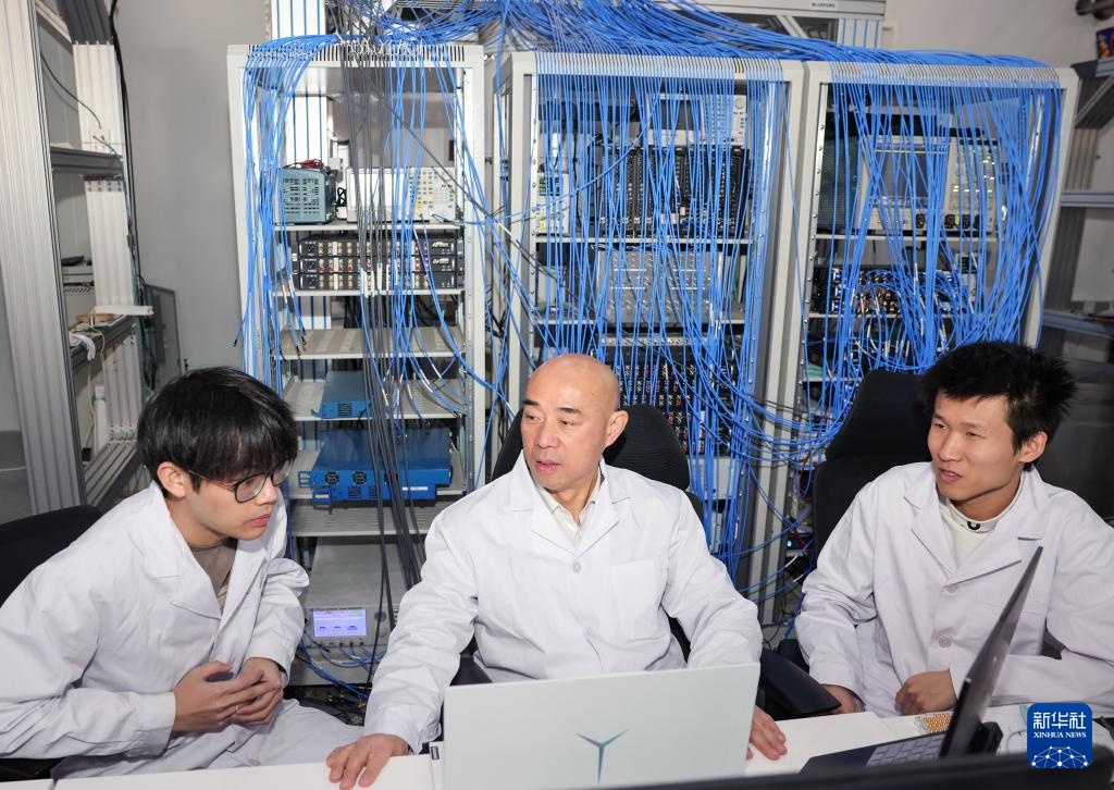 2月26日,中国科学院物理研究所怀柔研究部主任、综合极端条件实验装置首席科学家吕力(中)在极端条件量子态调控系统与科研人员交流。