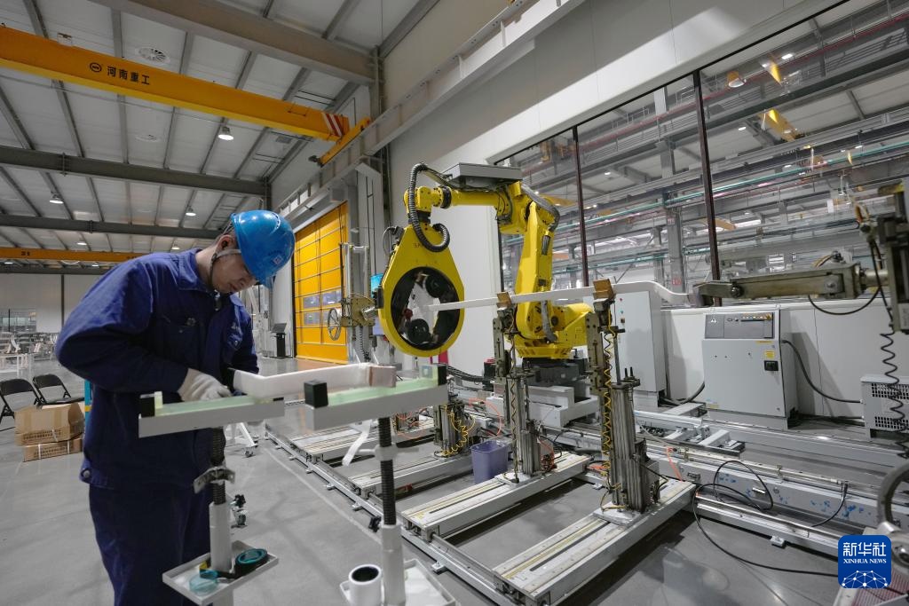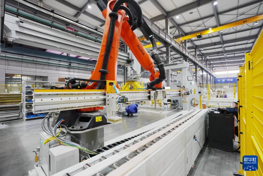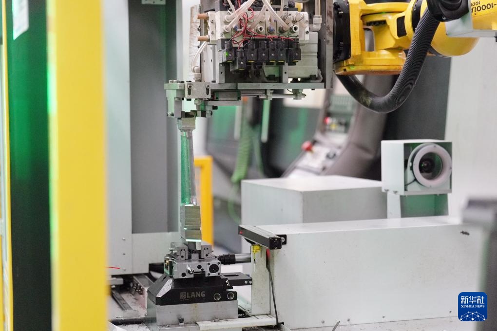 在哈尔滨电机厂有限责任公司线圈分厂智能制造车间,智能设备对绝缘线棒进行加工作业(2月26日摄)。
