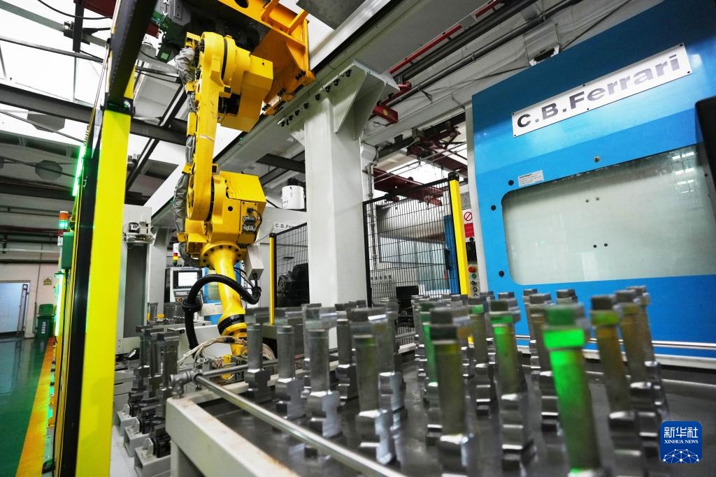 在哈尔滨汽轮机厂有限责任公司叶片分厂,中小叶片智能生产线上的机械臂在安装卡紧汽轮机叶片(2月26日摄)。