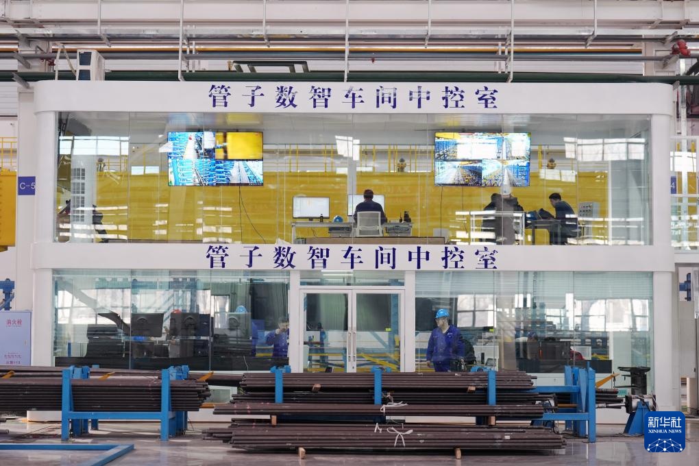 在哈尔滨锅炉厂有限责任公司管子分厂数智车间中控室,技术人员在进行指挥调度作业(2月26日摄)。