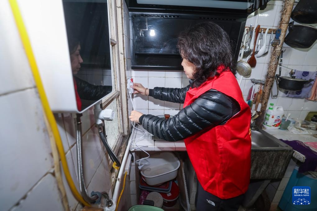 2月27日,在飞英街道米行街社区87岁独居老人徐宝珠家中,慕夕公益服务中心志愿者陶青在厨房为老人安装烟感报警器。