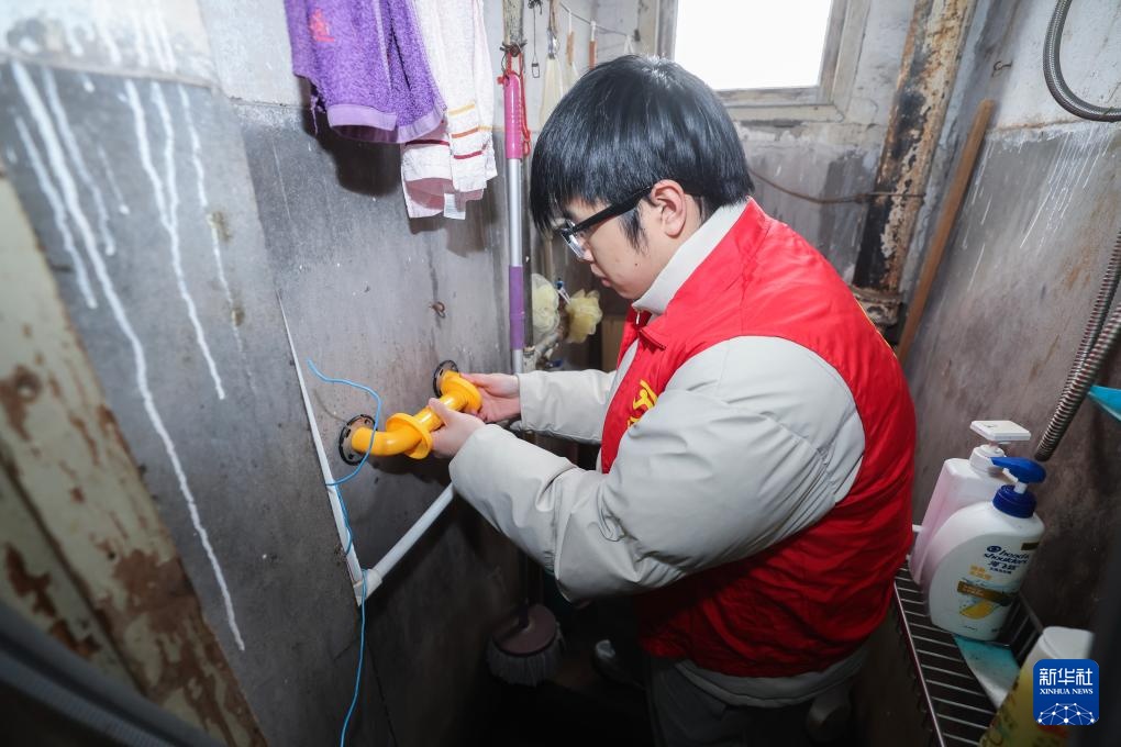 2月27日,在飞英街道米行街社区87岁独居老人徐宝珠家中,志愿者在卫生间为老人安装扶手。