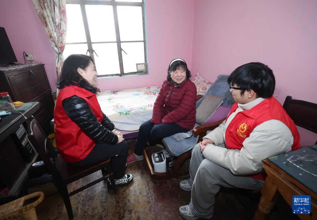 2月27日,在飞英街道米行街社区87岁独居老人徐宝珠(中)家中,慕夕公益服务中心志愿者陶青和同事一起陪老人聊天。