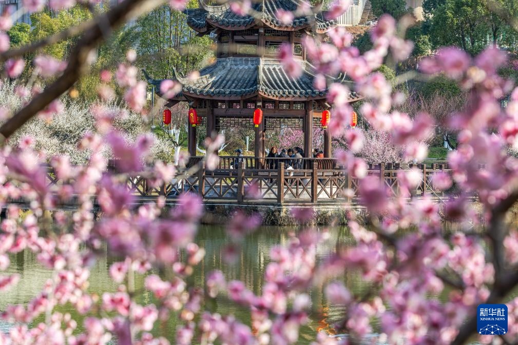 2月27日,游客在广西贺州市爱莲湖公园赏花。