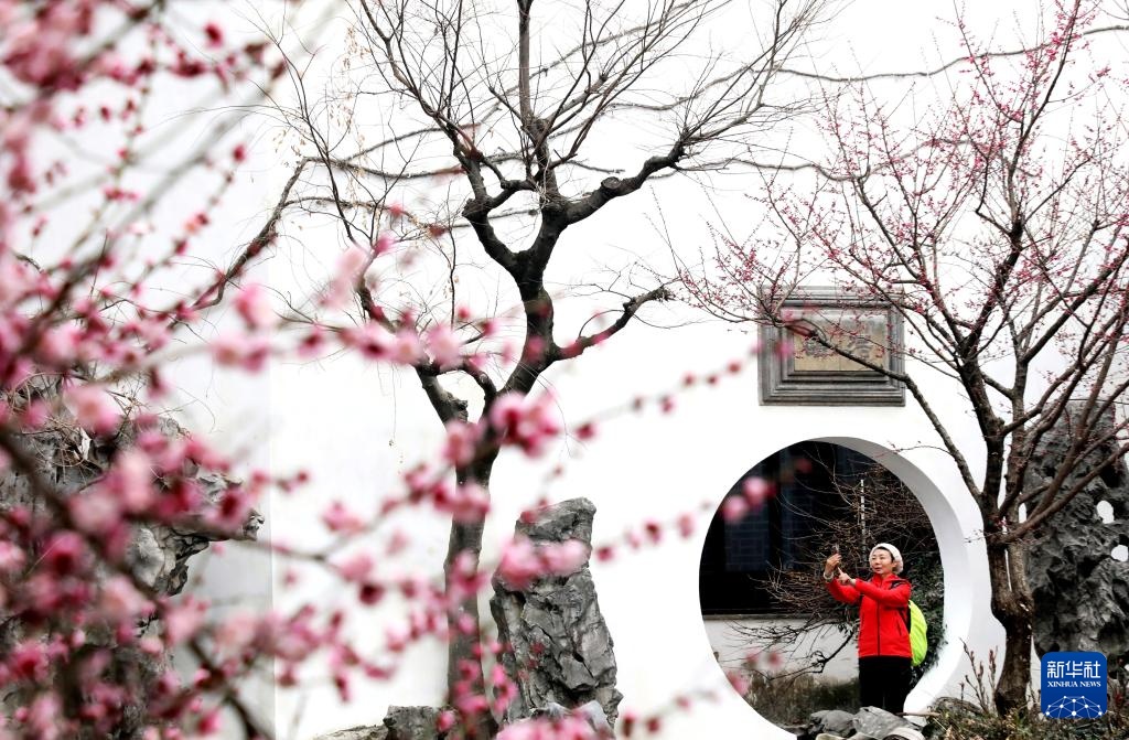 2月27日,游客在江苏苏州艺圃赏花游玩。