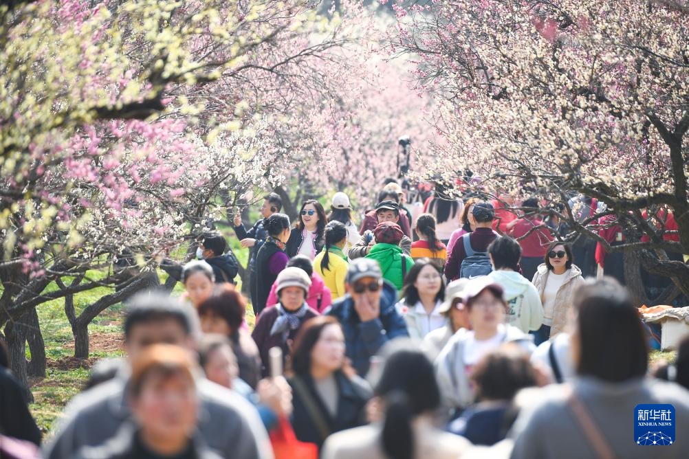 2月27日,游客在南京梅花山景区赏花游玩。