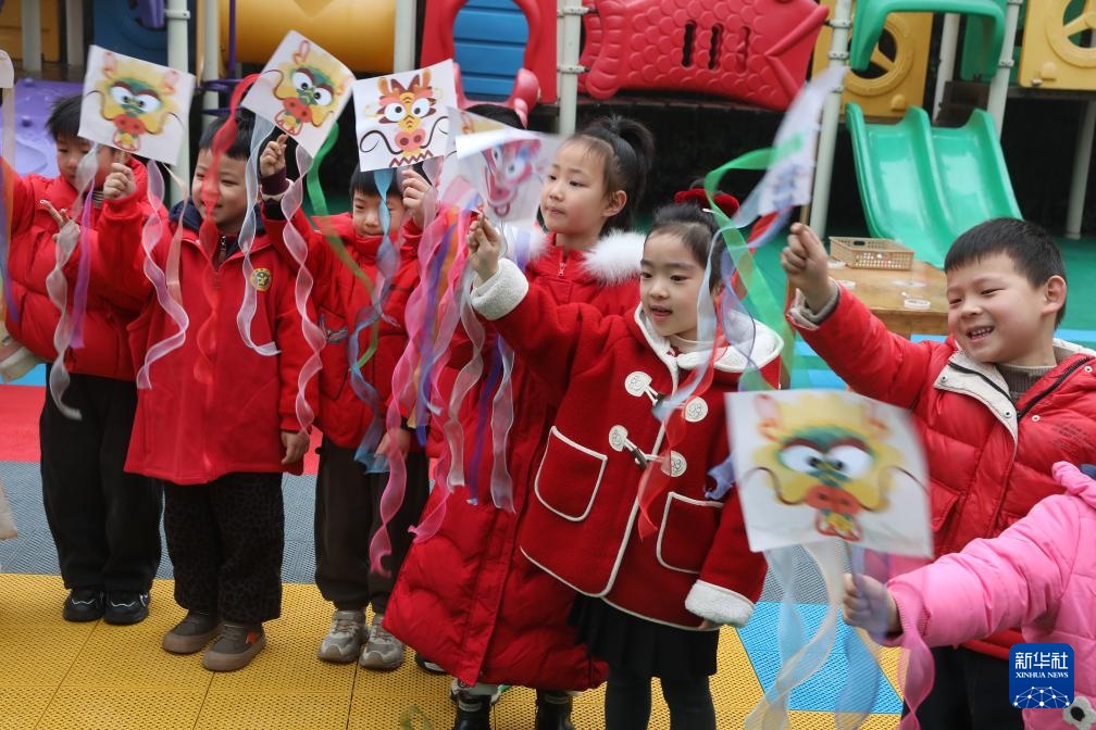 2月27日,江苏省宜兴市均陶幼儿园的孩子们展示“贴龙须”小手工作品。