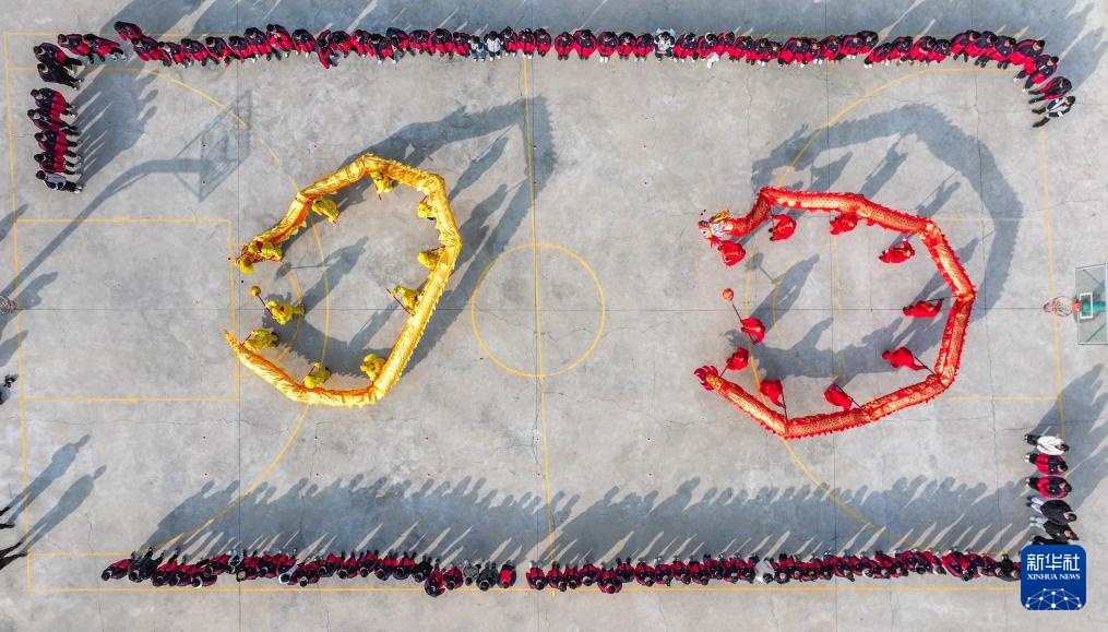2月27日,河北省遵化市苏家洼镇下石河中学的学生在进行舞龙表演(无人机照片)。