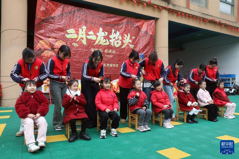 2月27日,江苏省宜兴市均陶幼儿园的老师为孩子们“梳龙头”“扎龙辫”。