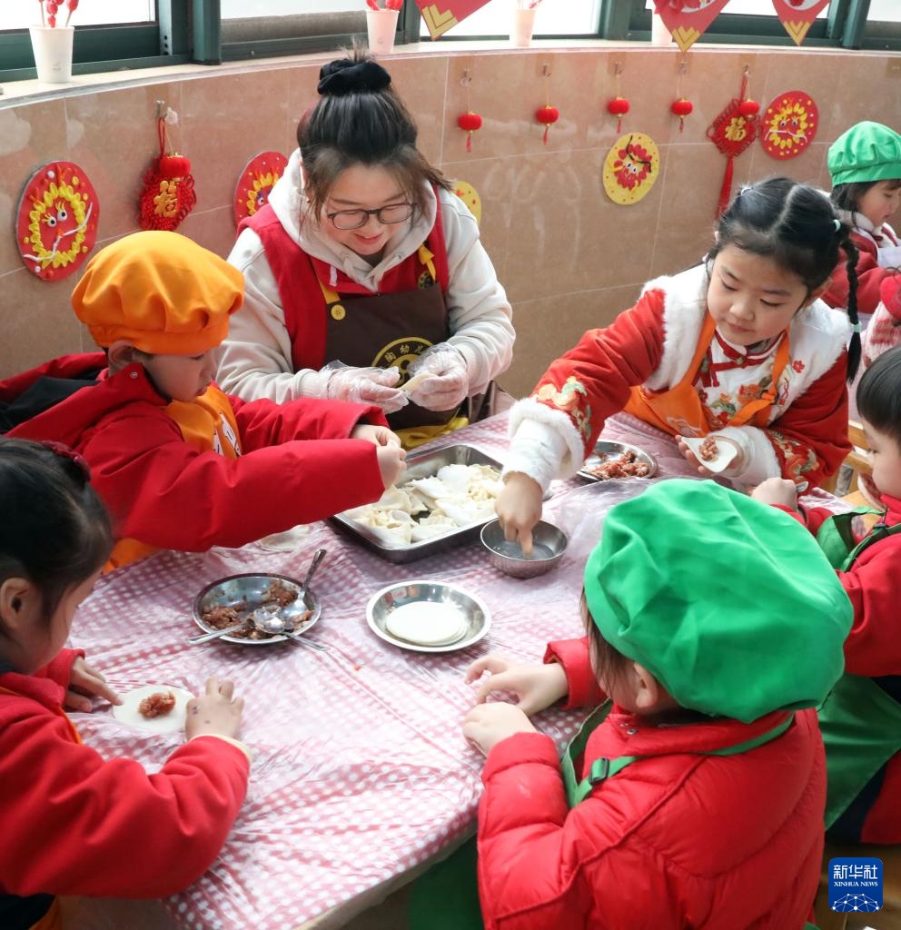 2月27日,江苏省宜兴市均陶幼儿园的老师带领孩子们包“龙耳”。