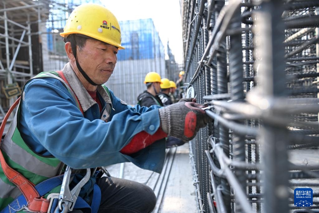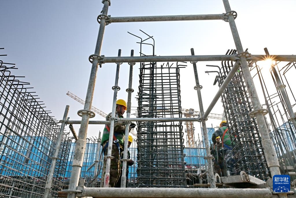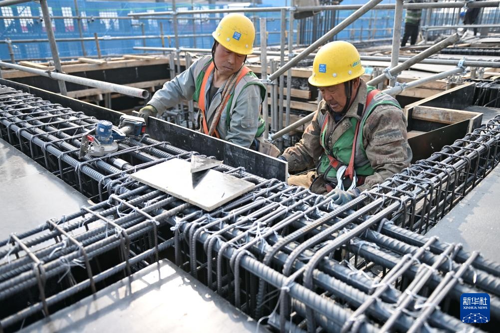 2月27日,中国五冶集团工人在雄安新区起步区第五组团大学城配套一期项目三标段建设现场捆绑钢筋。