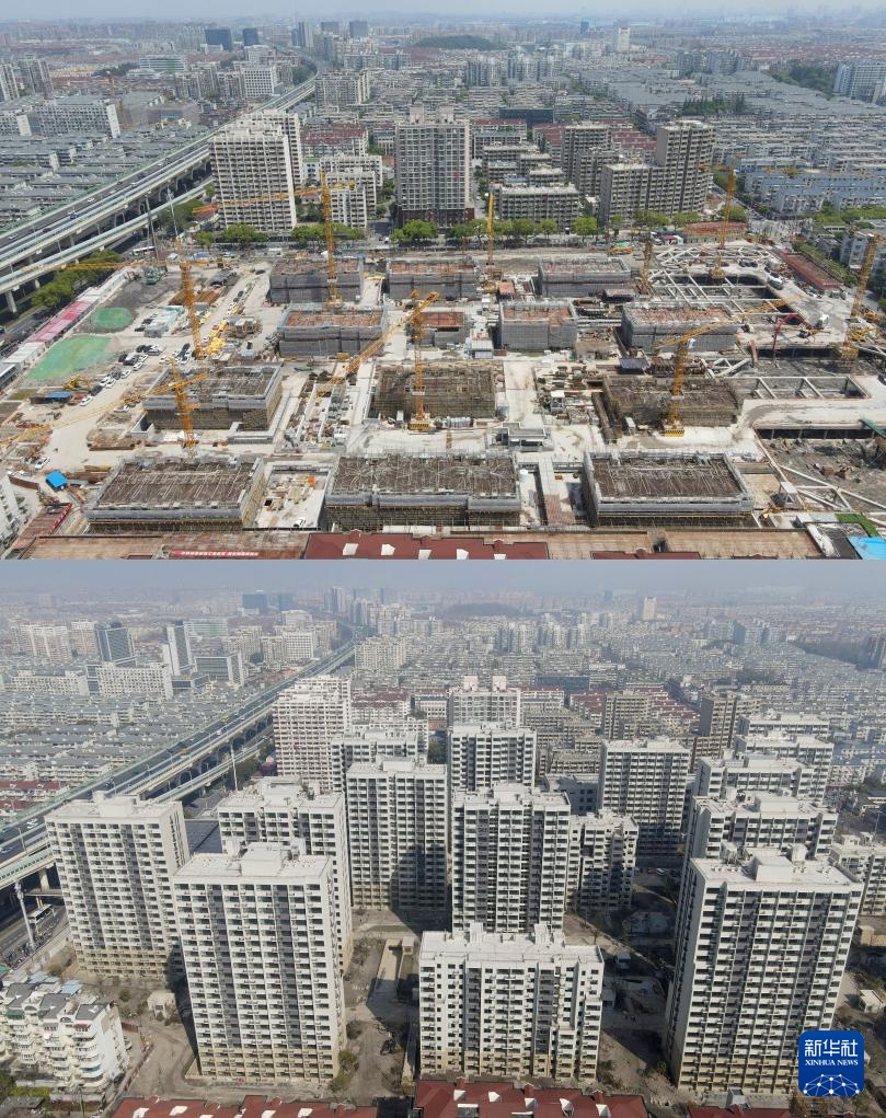 拼版照片:上图为2024年1月10日拍摄的两名市民在彭浦新村地铁站出站天桥上观看彭一小区非成套旧住房改造工程建设工地;下图为2025年2月28日在彭浦新村地铁站出站天桥上拍摄的建成后的彭一小区非成套旧住房改造项目。