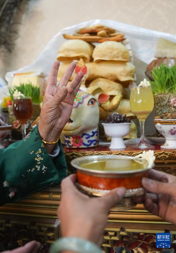 2月28日,身着藏装的拉萨市民在敬献青稞酒。