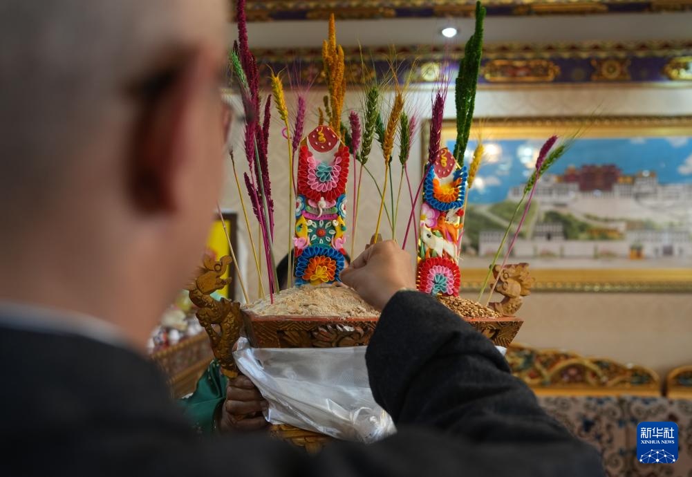 2月28日,身着藏装的拉萨市民在吃寓意五谷丰登的“切玛”。