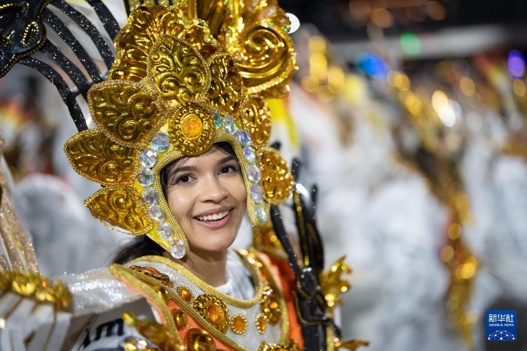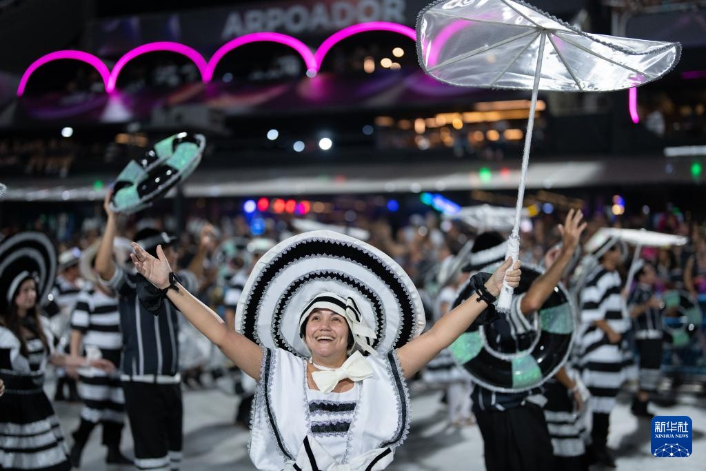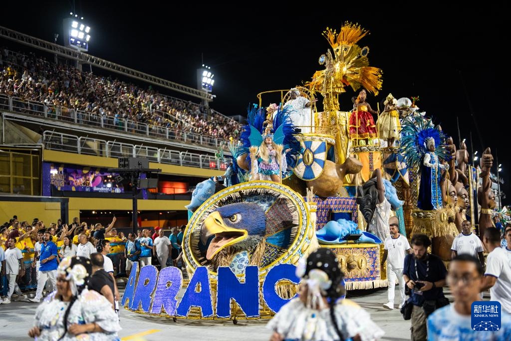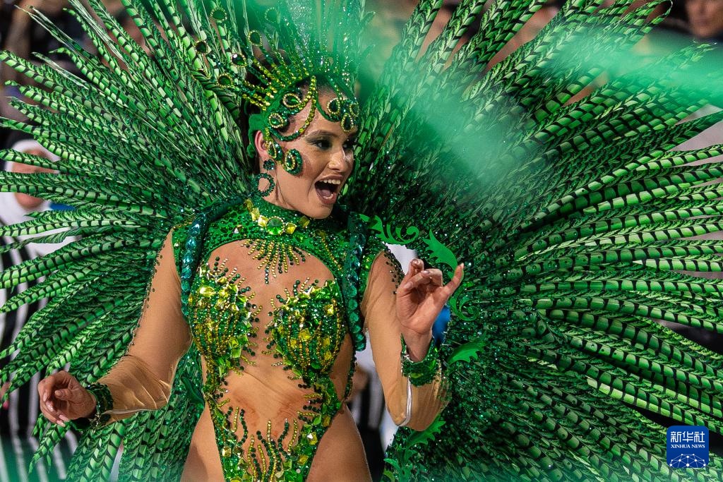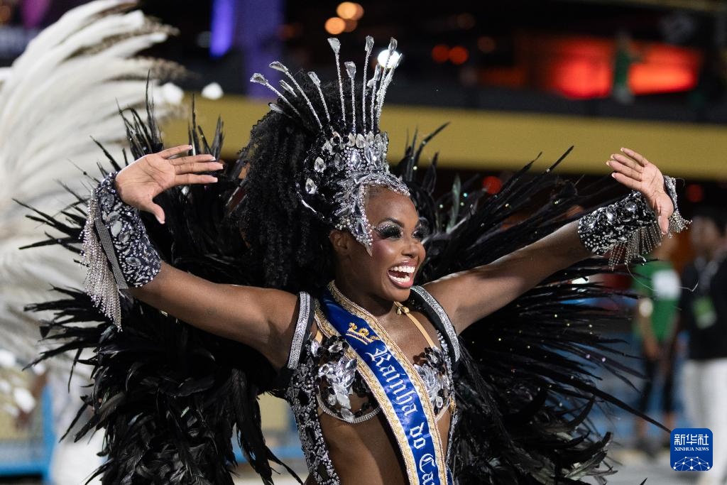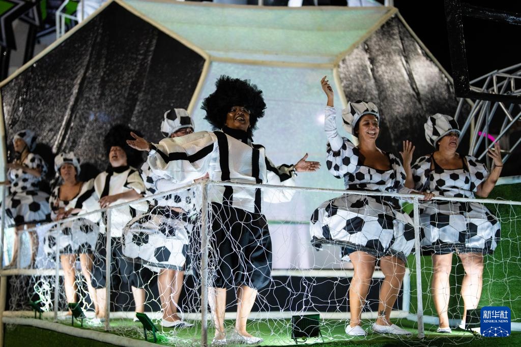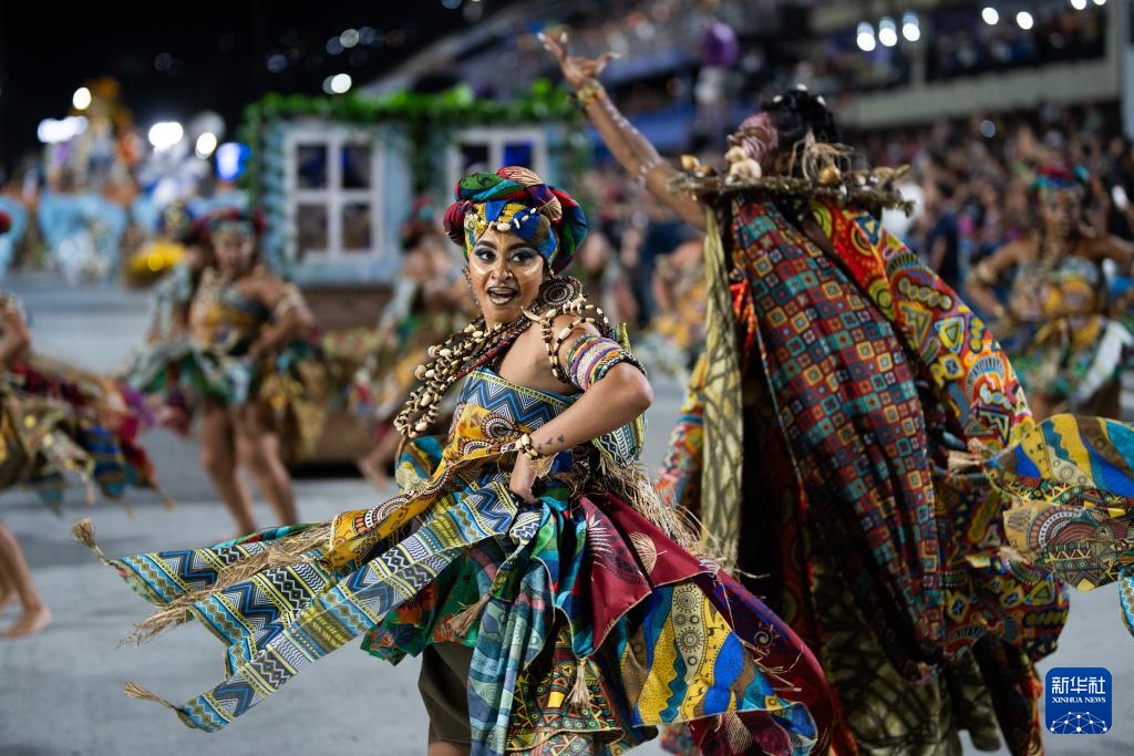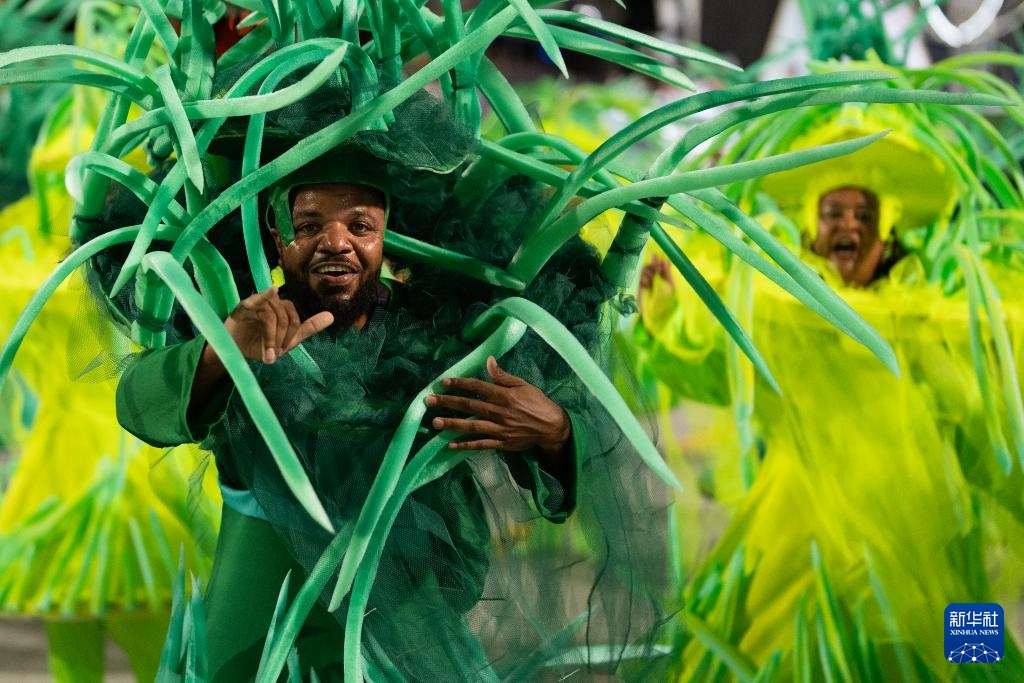 2月28日,在巴西里约热内卢桑巴大道,桑巴舞校的演员参加狂欢节游行。