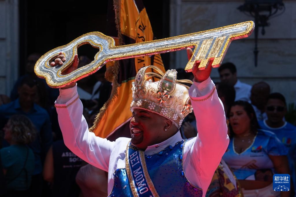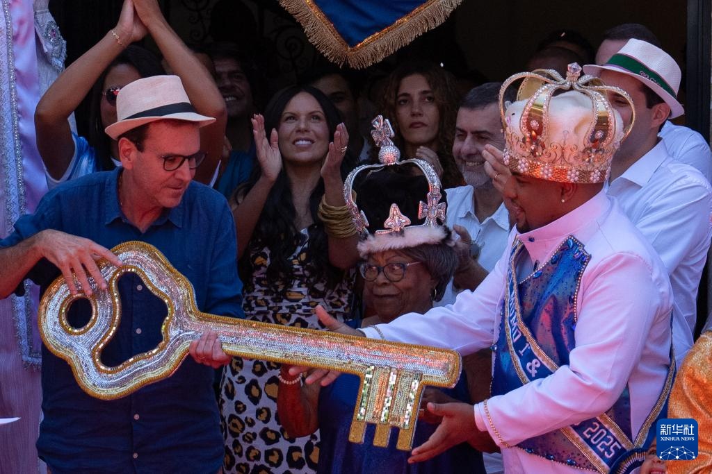 巴西里约热内卢市长爱德华多·帕埃斯2月28日在里约市长宫将一把象征城市管理权的金钥匙交给“狂欢节国王”,标志着2025年里约狂欢节正式拉开帷幕。