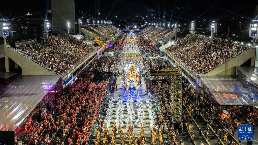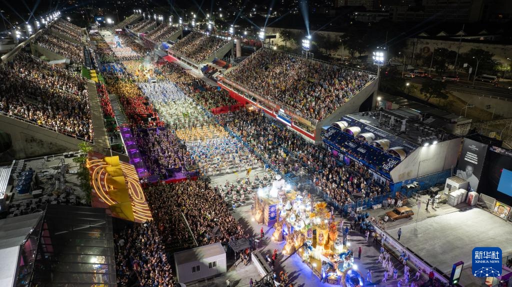 2月28日,在巴西里约热内卢桑巴大道,桑巴舞校队伍参加狂欢节游行(无人机照片)。