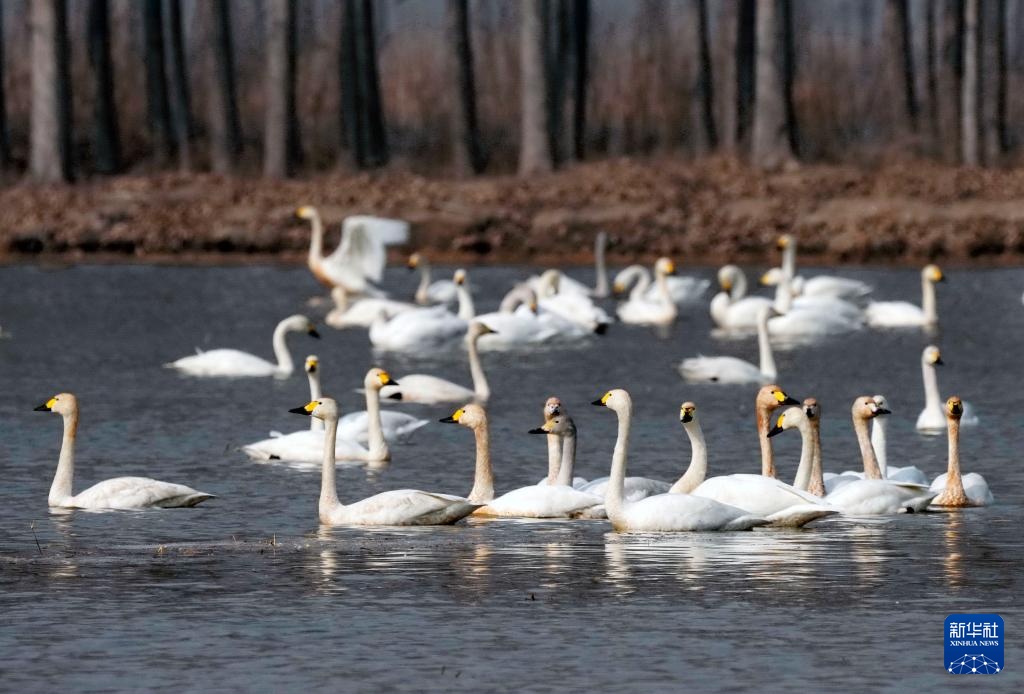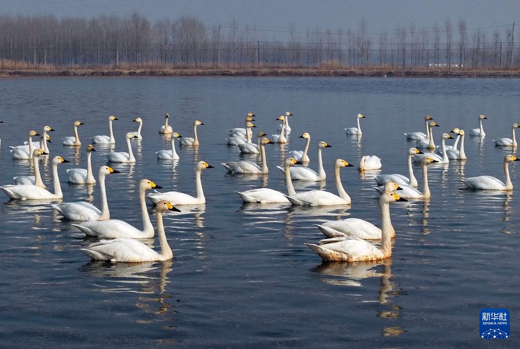 近日,大批天鹅飞临河北省唐山市曹妃甸区第五农场,在这里栖息、觅食,成为春季一道靓丽风景。