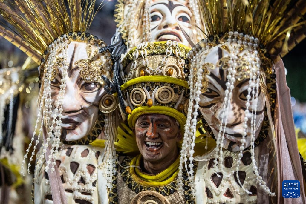 3月3日凌晨,在巴西里约热内卢的桑巴大道,桑巴舞校的演员参加狂欢节游行。
