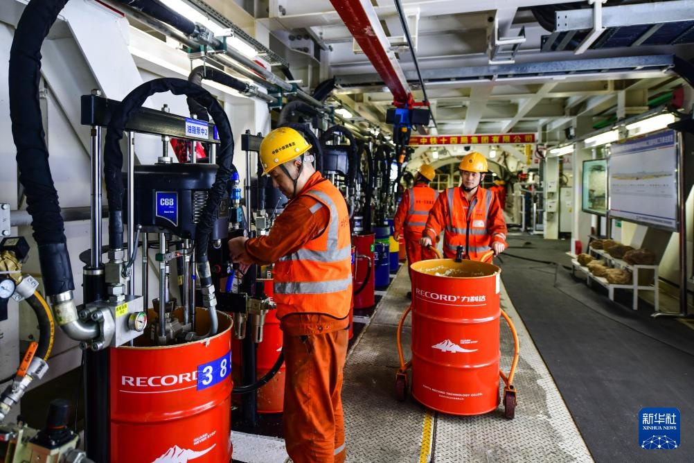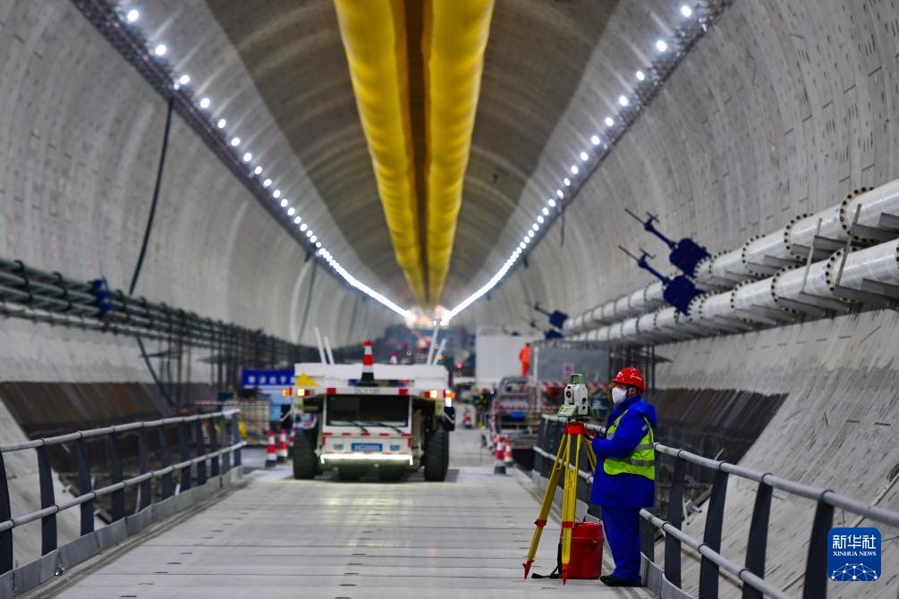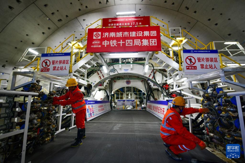 3月4日,中铁十四局建设者在济南市黄岗路穿黄隧道内施工作业。