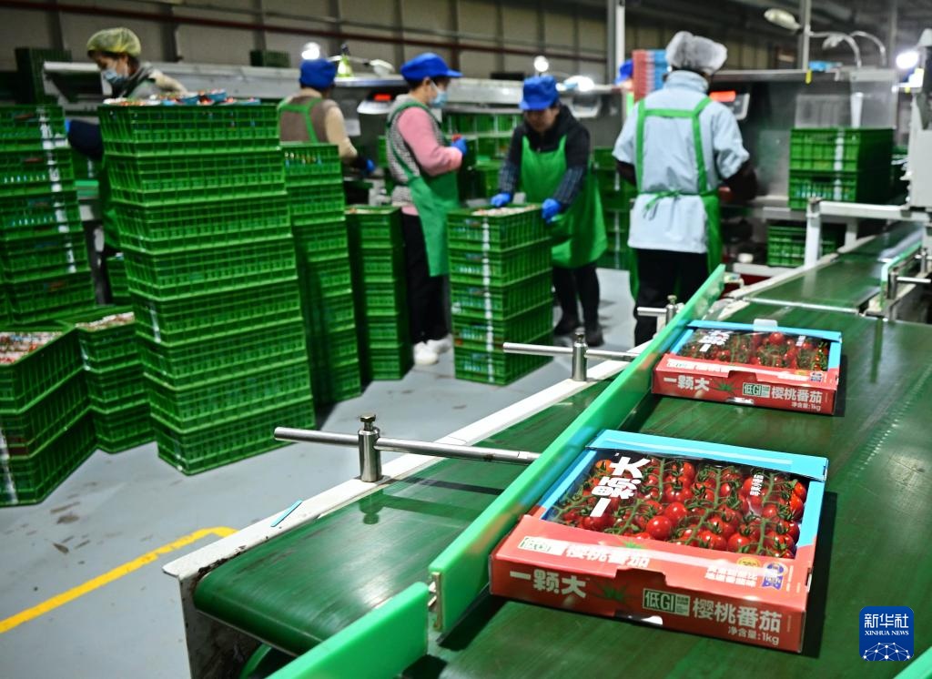 3月4日,在莱西市望城街道凯盛浩丰现代设施农业产业园,员工分装精品西红柿。