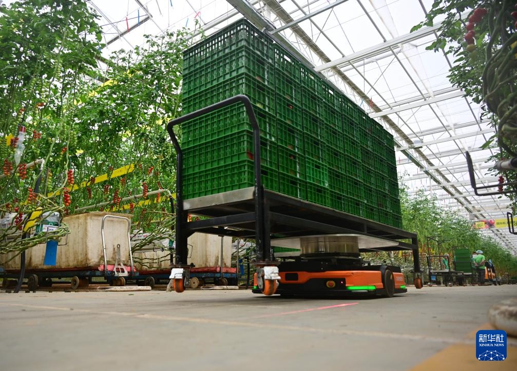 在莱西市望城街道凯盛浩丰现代设施农业产业园,AGV自主物流系统在运送采摘的农产品(3月4日摄)。