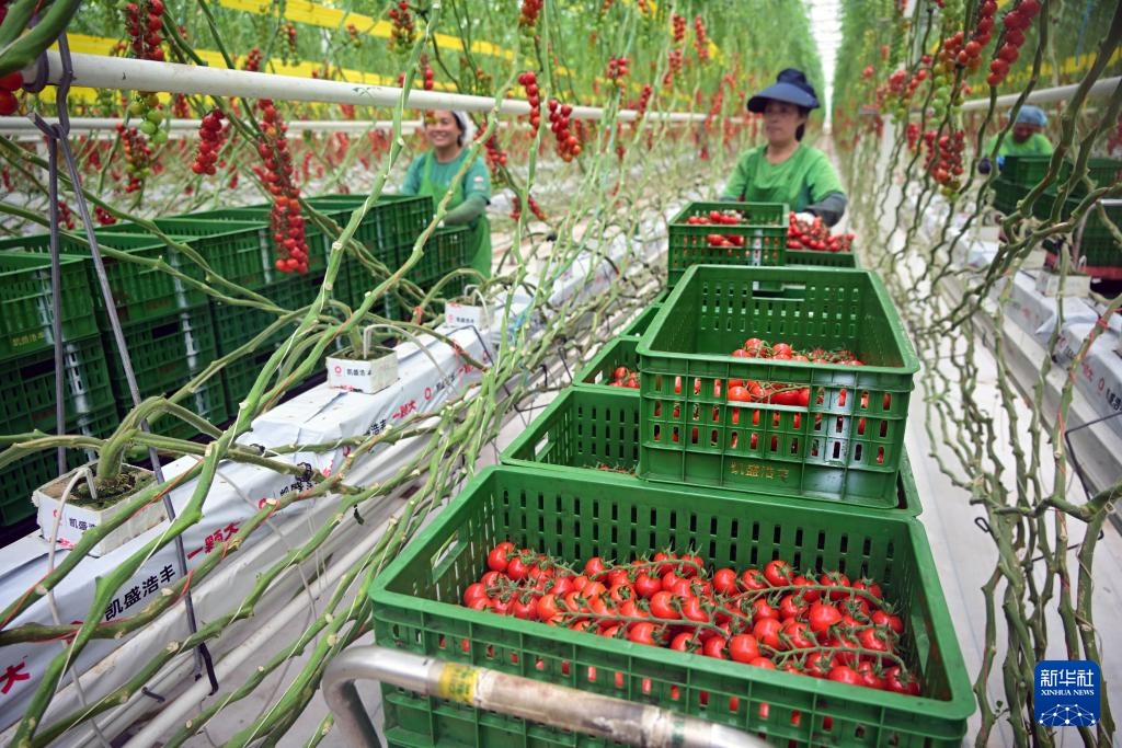 3月4日,在莱西市望城街道凯盛浩丰现代设施农业产业园,员工在采摘西红柿。